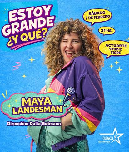 Nordelta, Actuarte Studio. El sábado 7 de febrero a las 21 horas, la comediante Maya Landesman se presentará en la sede Nordelta de Actuarte Studio con “Estoy grande, ¿y qué?”, un espectáculo de humor que propone una mirada divertida sobre el paso del tiempo y las distintas formas de vivir la adultez.