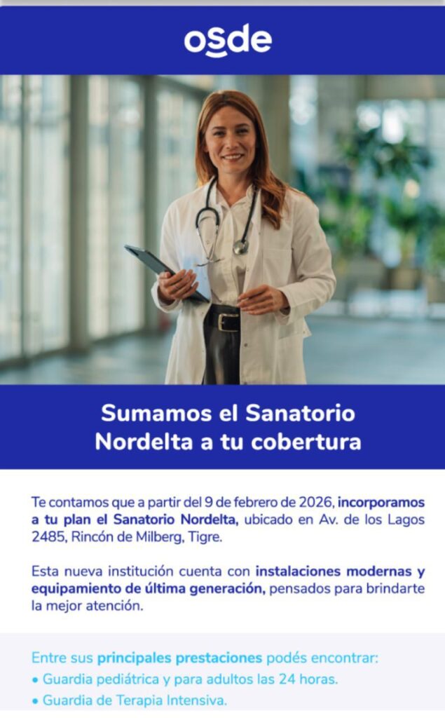 Desde el 9 de febrero, el Sanatorio Nordelta comenzó a brindar atención a afiliados de OSDE, tras confirmarse su incorporación a la red de prestadores de la prepaga en el centro médico ubicado sobre Av. de los Lagos 2485.