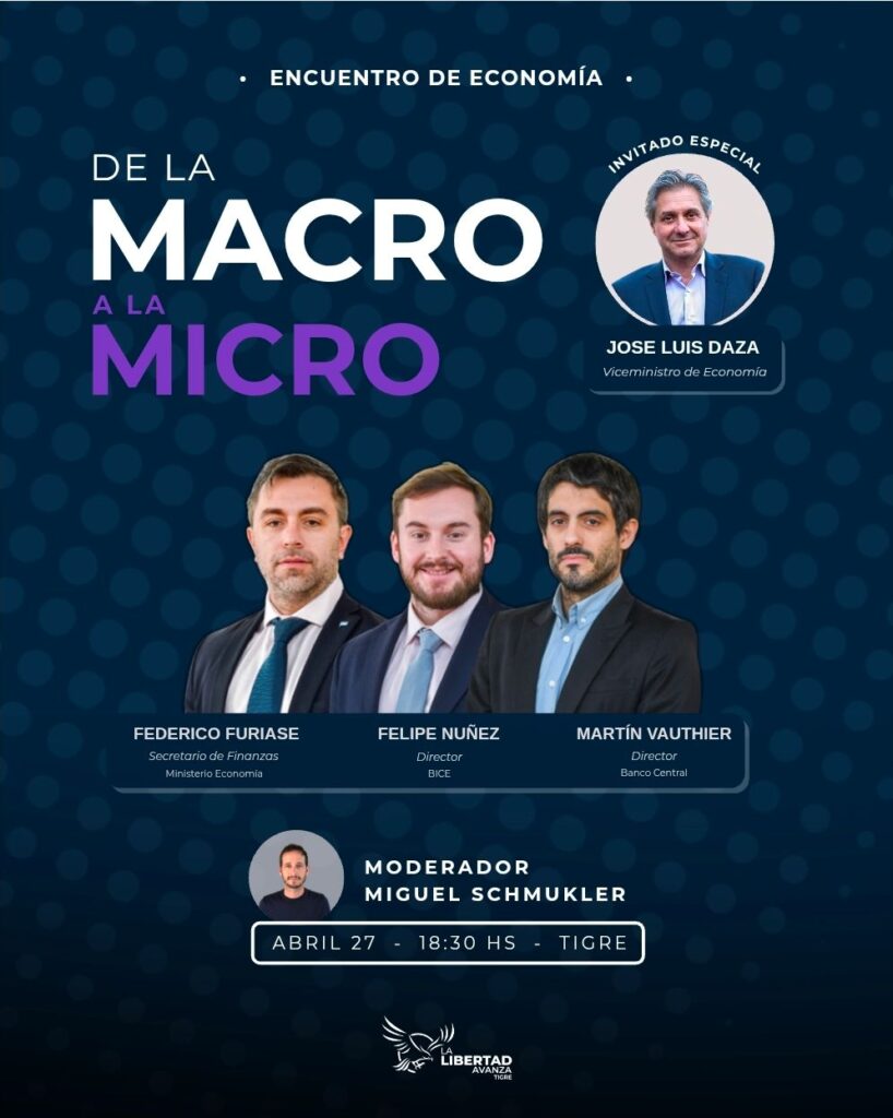 En Tigre, el lunes 27 de abril a las 18:30 se llevará a cabo en Nordelta el encuentro “De la macro a la micro”, una charla abierta de análisis económico con la participación de funcionarios y economistas vinculados al equipo económico nacional.